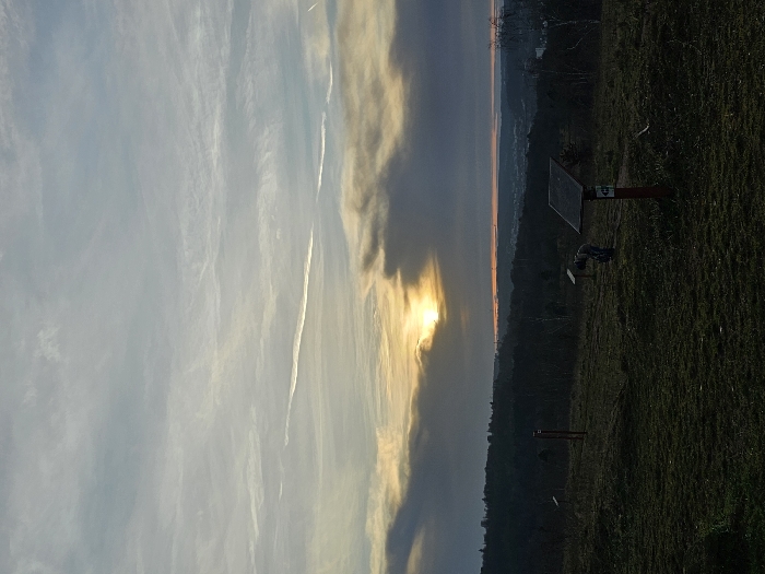 A landscape view features a vast sky with subtle cloud formations, highlighted by a bright, warm sunset