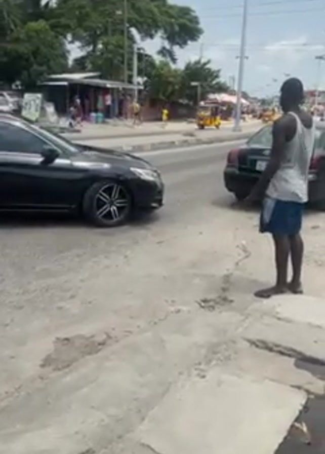 street scene with two cars, a black Honda and a black sedan, and a man standing on the side of the road. The man is wearing a white tank top and blue shorts, and he is holding a blue object in his hand. There are other people visible in the background near a small market stall. The road is cracked and uneven, and there is a curb along the side. The weather appears sunny and bright.