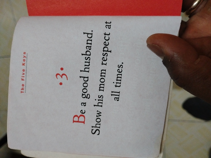 The image depicts an open book held over a light-colored tiled floor in the city of Kikuyu Township ward, Kenya. The visible left page of the book is white and displays red and black text. At the top, the heading "The Five Keys" is printed in red. Below this, the red numeral ".3." is displayed. Following the numeral, the text reads "Be a good husband," with "Be" in red and the rest in black. Beneath this, in black text, is the phrase "Show his mom respect at all times." The right page or cover of the book is solid red. A dark-skinned human thumb is visible in the lower right portion of the image, partially obscuring the bottom text on the page, indicating the book is being held. A gold-colored ring is visible on an adjacent finger. The floor beneath the book exhibits a geometric pattern, consistent with tiles.