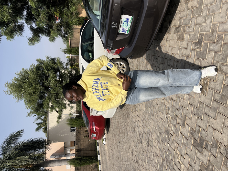 An image taken in Gura Top, Nigeria, depicts a young female standing outdoors on a sunny day. The individual, appearing to be of African descent, wears a yellow hooded sweatshirt with "OKLAHOMA STATE" printed in blue on the chest and a blue "87" on the left sleeve. She is also wearing light blue, wide-leg jeans and white athletic shoes with black and a subtle yellow-green accent. Her dark hair is styled in braids and pulled back. Her hands are clasped in front of her waist, and she is looking towards the left side of the frame with a slight smile. The ground beneath her is paved with interlocking grey concrete pavers arranged in a herringbone pattern. In the background, multiple vehicles are parked, including a dark grey Honda Civic sedan visible on the right with a Nigerian license plate displaying "ABUJA ABC-654NF." A white sedan is partially visible behind the female, and a red sedan is parked further back on the left. Beyond the vehicles and a low wall, light-colored buildings (peach and cream) are visible. The scene includes various green trees and foliage under a clear blue sky, with pronounced shadows indicating bright daylight conditions.