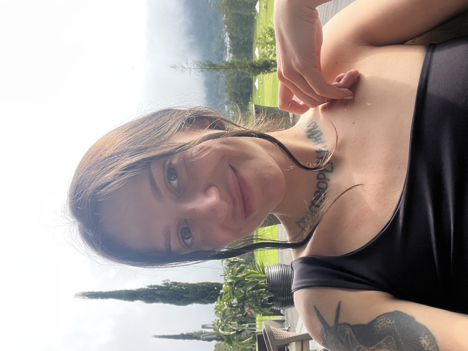 A woman with light brown hair and fair skin poses in a selfie. She wears a black top. Tattoos are visible on her collarbone and upper arm. The background features trees and greenery, suggesting an outdoor setting. Her hand touches her chest or collarbone. The image is slightly angled. She is lightly smiling, looking directly at the camera.