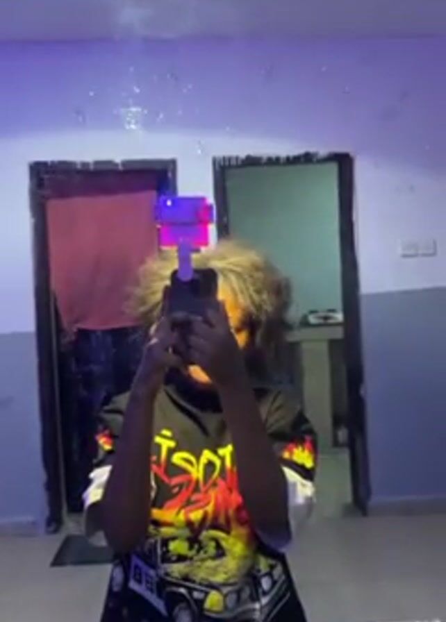 A person stands in front of a mirror holding a smartphone attached to a purple light. The person has dark skin, light-brown hair, and is wearing a black, short-sleeve shirt with yellow, orange, and red graphics, with a white sleeve trim. The room is small and has two doorways with visible rooms. The wall in the room is white with a gray border at the bottom. On the marble vanity counter, there are various personal care items. The purple light illuminates the room, and what appears to be a star projector emits small dots of light on the ceiling.