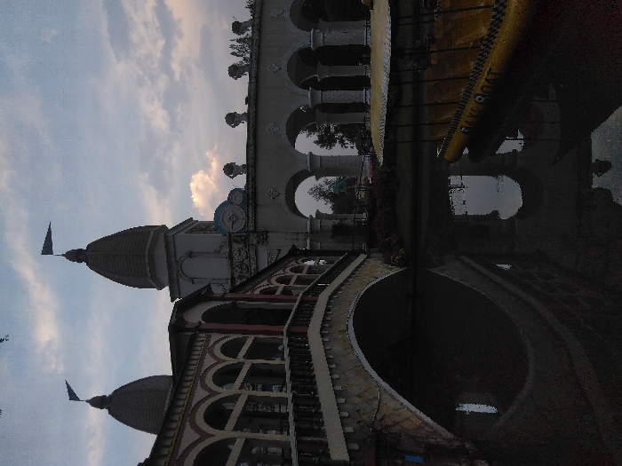 The image displays an architectural complex featuring prominent domes and arches, situated alongside a body of water in Ciudad de San José, Costa Rica