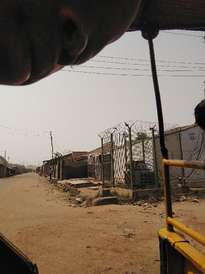 This image depicts an outdoor street scene in Sabon Tasha, Nigeria, observed from within a vehicle, indicated by a partial yellow metal frame in the lower right and a blurred dark form in the upper left. The environment features an unpaved, reddish-brown dirt road extending into the distance, with scattered debris and sparse vegetation along its edges. On the left side of the road, a lone individual wearing a striped garment is visible, walking away from the camera. A line of single-story buildings with mixed roofing materials, including corrugated metal and red tiles, borders the left side of the street. On the right, a compound is secured by a green metal fence topped with multiple strands of concertina wire. Inside this enclosure, a structure covered in white material displays a "UNHCR" logo. Overhead power lines are strung across the scene, supported by wooden utility poles. The sky is uniformly light and hazy, indicating a bright, possibly dusty, day.