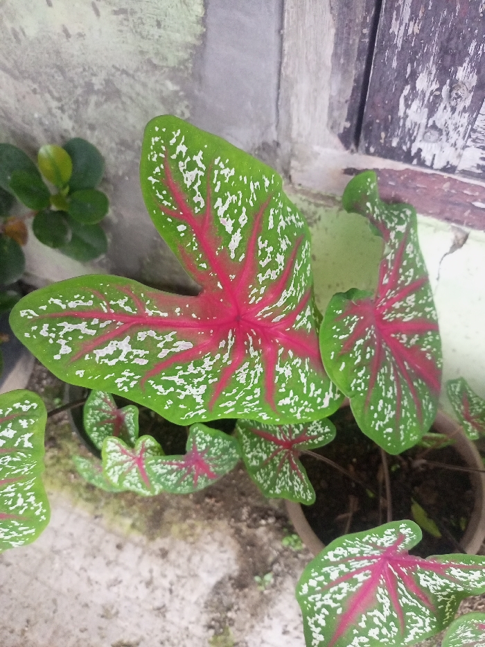 The image displays a close-up view of several Caladium plants in an outdoor setting in Bamhori, India. The prominent subjects are numerous heart-shaped or sagittate leaves, characterized by a vibrant green base, radiating red veins, and scattered irregular white variegation. The leaves vary in size, indicating multiple plants or different growth stages. At least one brown, terra cotta-style pot containing dark soil is visible in the lower right, housing some of the Caladiums. The background consists of a light gray, textured wall, possibly concrete or stucco, showing wear and discoloration, positioned to the left and upper sections. In the upper right, a section of a dark, weathered wooden frame, likely part of a window or door, is visible. Small, green, rounded leaves of an additional plant are faintly discernible in the upper left background. The ground surface in the lower foreground is a light-colored, textured material, possibly concrete. No human figures or specific actions are present in the scene.