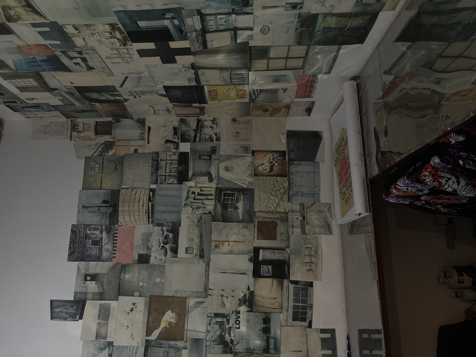 A room's ceiling and wall are densely covered with square-shaped images. These images, a mixture of black and white and color, feature a variety of subjects, including architectural elements like windows, interiors, and text. A rolled poster with text "WHEN CROSSING BORDER MY HAIR IS ALWAYS ON FIRE WHY" hangs on the wall. Parts of a dark patterned piece of furniture and a door frame are visible.
