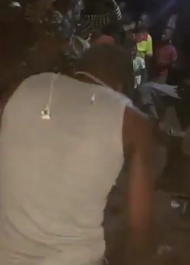 man in a tank top, hat, and patterned shorts dancing in a crowd at an outdoor event at night. He is facing away from the camera. People surround him, some dancing as well. The setting appears to be a casual outdoor gathering.