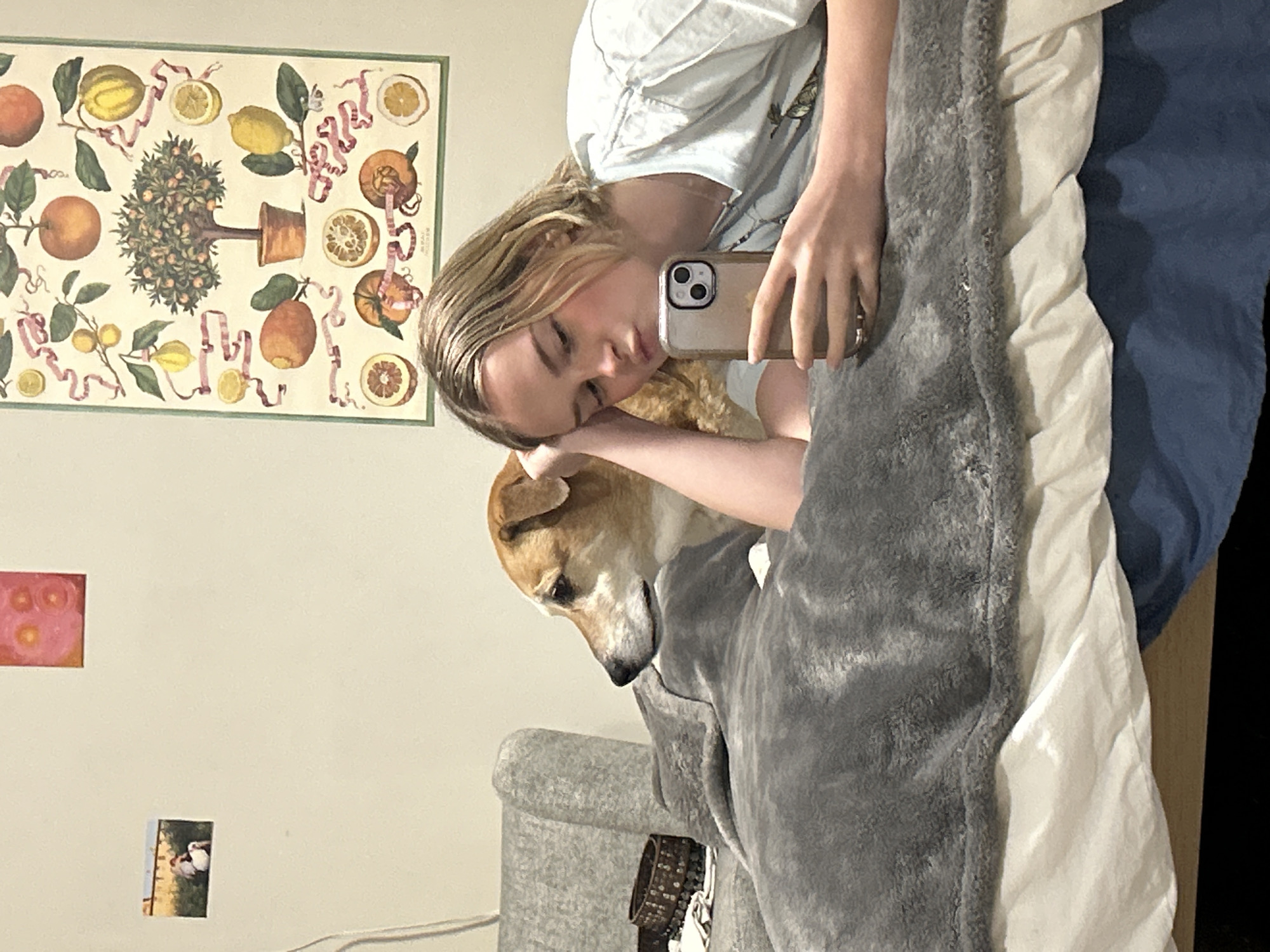 A young person is taking a selfie with their dog indoors. The young person has blonde hair and is wearing a light-colored shirt. They are holding a smartphone with a dual-lens camera in their right hand, positioned to capture their face and the dog's. The dog has brown and white fur and is nestled close to the young person. Both are lying on a bed covered with a grey fuzzy blanket, white sheets, and a blue blanket. The setting is an interior room with light beige walls. A framed print of fruits and plants is hanging on the wall behind them. Below it, there are two smaller images or pictures on the wall. In the corner of the room, there is a grey couch. It is not possible to confirm the location is in Vancouver, Canada based on the image.
