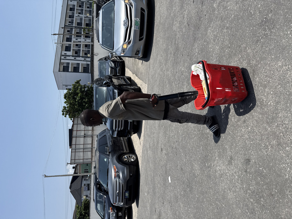 A dark-skinned adult male is depicted walking from left to right across a paved parking lot in Ilado, Nigeria, under a clear blue sky