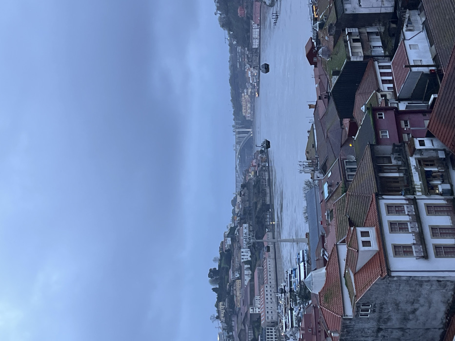 A cityscape along a wide river under a cloudy sky. The architecture consists of tightly packed buildings with red-tiled roofs. A cable car and bridge are visible in the distance. The scene is gray with overcast skies and a hazy view of the horizon. The perspective is from an elevated position, looking down on the urban landscape and waterway.