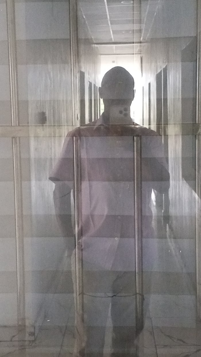 A single individual is observed in a full-body reflection, viewed from behind, standing within an indoor corridor or hallway located in Lokoja, Nigeria