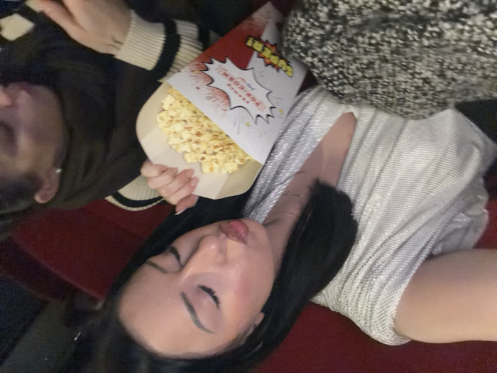 Two people are at the movies. One wears a black sweater with beige stripes, holding a popcorn bucket. The other wears a sparkly silver top, with long black hair falling around her face, lips slightly puckered. The seats appear to be red. A patterned grey/black jacket can also be seen.