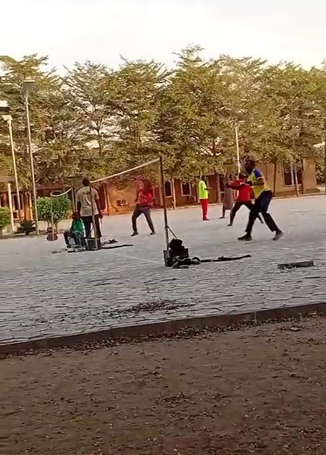 group of about a dozen men playing what appears to be a game resembling badminton or tennis, on a large paved area, with a net stretched between two poles