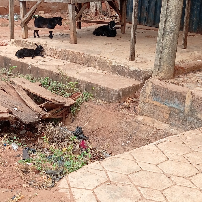 - "This outdoor scene, situated in Nsukka, Nigeria, displays an area characterized by concrete and dirt surfaces, occupied by three black goats and various forms of refuse" by FM-z71CF3, licensed under CC BY 4.0