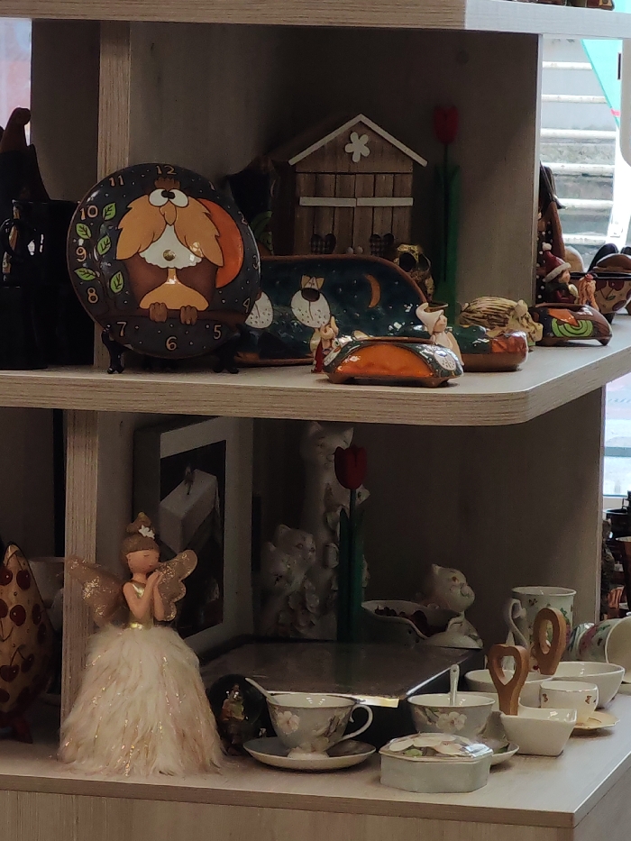 This image captures a multi-tiered display of ceramic and decorative items within an indoor setting in Vidin, Bulgaria