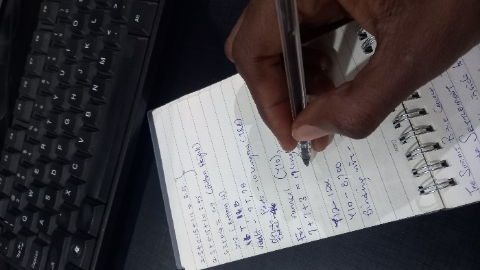 A dark-skinned right hand holds a transparent ballpoint pen with blue ink, poised to write on a white, ruled, spiral-bound notebook. The notebook displays handwritten calculations and notes in blue ink, including entries like "2.3 + 0.15 + 1.1 = 3.55," "Bottom Height," "For runners (Y10)," "7+7+3 = 17 Lengths," and financial figures such as "Y12 - 12K" and "Y10 - 8,700." Partial text at the bottom reads "The Summit Base Camp" and "Settlement." A black QWERTY computer keyboard is visible in the upper background. Both the notebook and keyboard rest on a dark, flat surface. The specific location within Abuja, Nigeria, cannot be determined from the visual information provided.