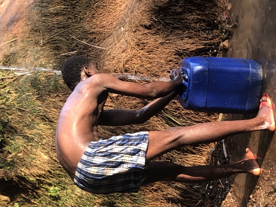 In Ukwu-Abwa, Nigeria, a lone dark-skinned male is depicted outdoors in bright sunlight. He is positioned leaning forward, bare-chested, wearing blue and white plaid boxer shorts and red flip-flops. His skin is visibly wet, with water droplets reflecting the sunlight. A thin stream of water descends from an unseen source above, falling onto his hands, which are placed within the opening of a dark blue, rectangular plastic jerrycan situated on the wet ground. The background consists of a dense, textured bank of dry, brownish-yellow vegetation and earth. The ground where the individual stands is wet, indicating continuous water flow or recent activity.