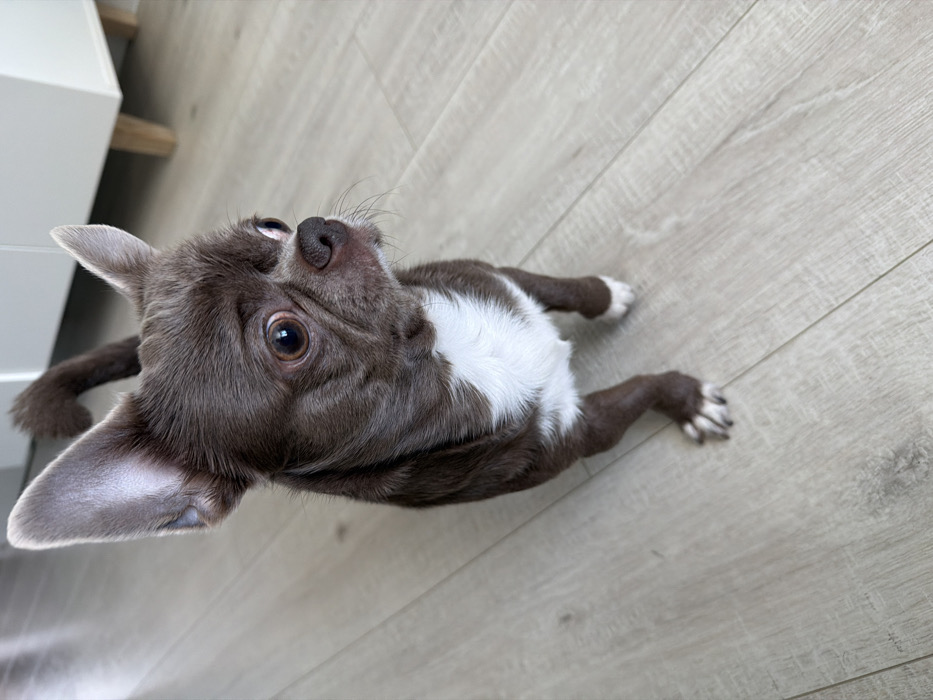- "A dark brown chihuahua, featuring a prominent white chest blaze and white markings on its front paws, stands on a light-colored, wide-plank laminate floor" by FM-MNll92, licensed under CC BY 4.0