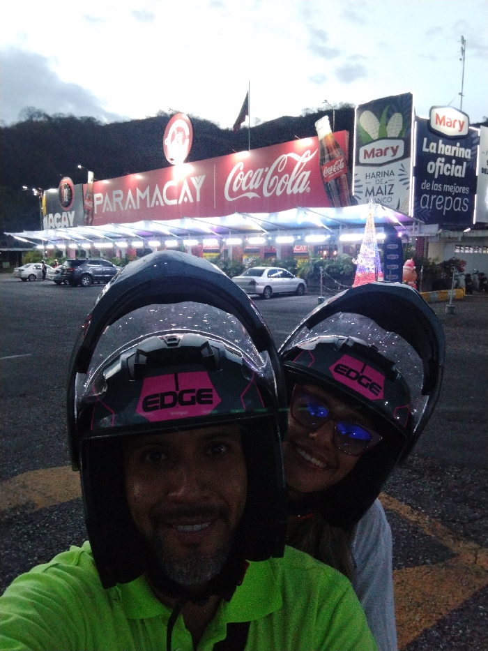 A couple wearing motorcycle helmets labeled "EDGE" poses in front of a brightly lit business. Banners advertise "PARAMACAY," "Coca-Cola," and "Mary Harina de Maiz." Cars are parked nearby. In the background, mountains are visible. The lighting suggests it's early evening. The woman wears glasses, and the man is wearing a green shirt.