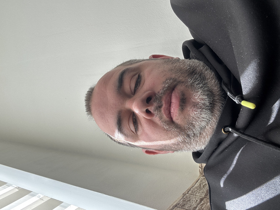 The image presents a close-up, low-angle indoor portrait of an adult male in Peshtera, Bulgaria