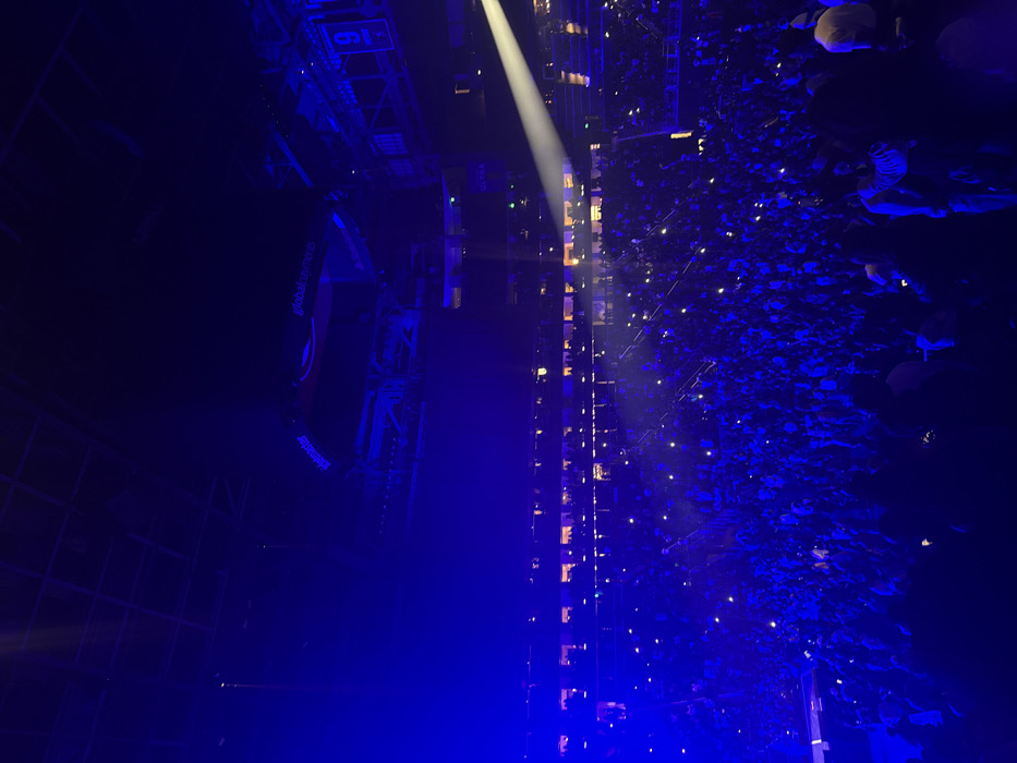An indoor concert venue filled with a crowd. A bright spotlight shines vertically from the top. The crowd is lit by many small lights, possibly from phones. Arena seating is visible on the left, along with banners. The overall lighting is blue and dark.