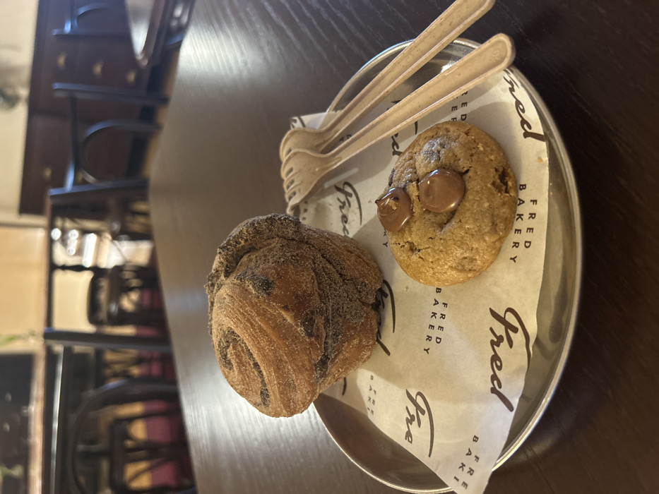 The image displays a close-up of a circular metal tray on a dark wooden table, situated within an indoor cafe environment. The tray holds a white paper liner bearing the repeated "Fred BAKERY" logo. On this liner, two baked items are presented: a large, cylindrical pastry with discernible flaky layers, dusted with a cinnamon-sugar mixture, and a smaller, round chocolate chip cookie topped with two distinct drops of melted chocolate. Three light-colored, presumably disposable, sporks are stacked next to the cookie on the right side of the tray. The background is out of focus, showing dark wooden chairs and a dark wooden cabinet, consistent with the interior of a commercial establishment. Based on the visible branding, the location is identified as Fred Bakery, located at 41-42 Rathbone Place, London, United Kingdom. No individuals are present in the frame.