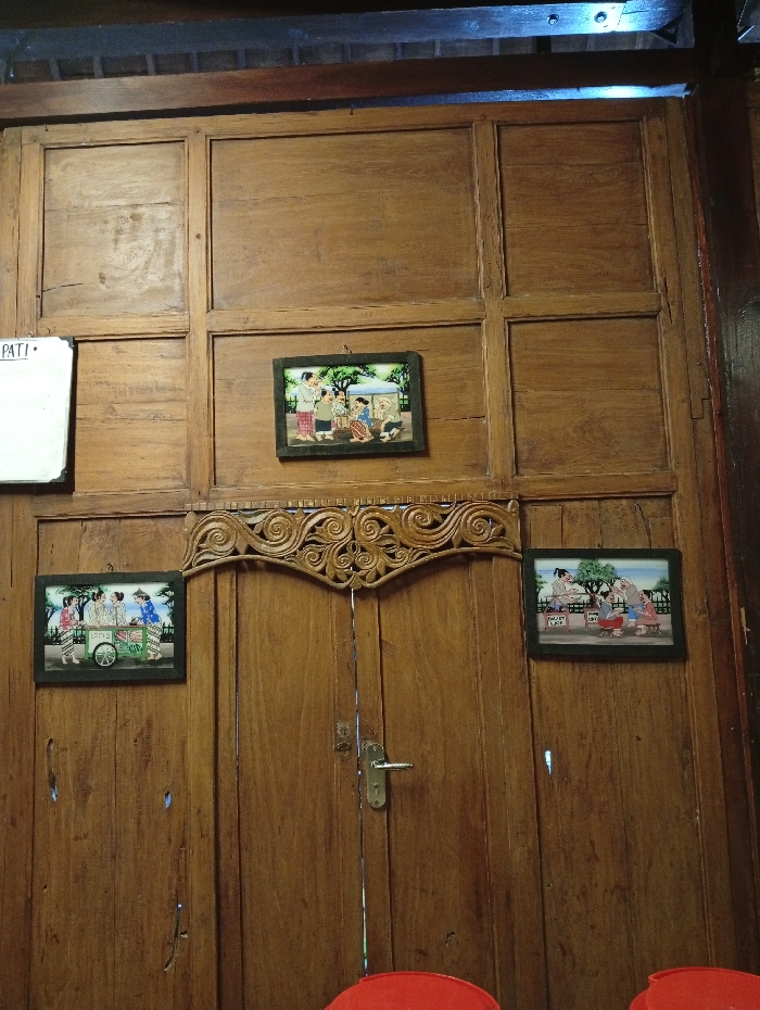 An indoor scene in Margorejo, Indonesia, depicts a textured wooden paneled wall and a central double door crafted from matching wood. The door is fitted with a silver-colored metal handle and lock mechanism, and is surmounted by an intricately carved wooden arch displaying floral and scrollwork motifs. Three framed pictures, approximately 8x12 inches each, are mounted on the wooden surfaces. The uppermost picture, centered above the door, illustrates a group of approximately eight figures in traditional attire gathered around a table or stall. A second picture, positioned to the left of the door, depicts four female figures near a pushcart visibly labeled "LUPIS". The third picture, to the right of the door, shows two figures interacting near a vendor's stand with text identifying "NASI UDUK". A white board, partially visible on the far left wooden panel, bears the capitalized text "PATI". Two red chair backs are partially visible at the bottom edge of the frame. The ceiling area above the wall features dark wooden beams.