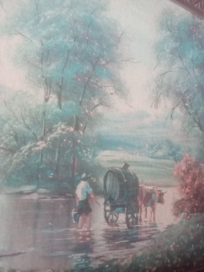 The image is a painting depicting a pastoral, rural landscape dominated by a cool, bluish-green color palette with accents of reddish-brown. A central light source appears to emanate from the upper middle, illuminating a dense canopy of deciduous trees that frames the upper and background portions of the scene. In the midground, a shallow body of water, resembling a stream or flooded path, extends across the lower half of the frame. A male figure, wearing a light-colored shirt and dark shorts, stands mid-thigh deep in the water on the left-center, oriented with his back partially to the viewer, facing towards the right. He holds a light-colored bucket in his left hand. To his immediate right, a two-wheeled wooden cart, loaded with a large, dark-colored barrel, is also positioned in the water. A brown and white cow with visible horns is partially observed to the right of the cart, standing in the water and appearing to be tethered to or pulling the cart. The right bank of the water features a patch of reddish-brown foliage. Beyond the water and subjects, a grassy expanse rises to rolling hills in the distant background, where faint structures, possibly a small village, are discernible under a hazy sky. This painting portrays a generalized, idealized rural setting and does not contain any identifiable landmarks or specific geographical features consistent with a location within the city of Tinaquillo, Venezuela.