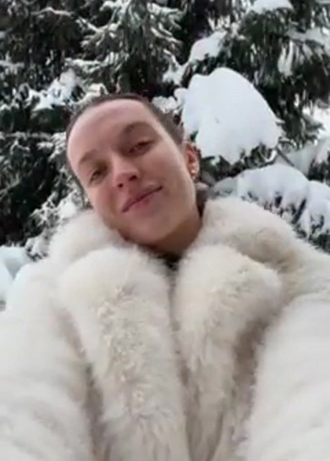 A person with their hair pulled back in a bun, wearing a white fur coat, stands in the snow with snow-covered evergreen trees behind them. The person looks into the camera and smiles slightly. Snow is falling.