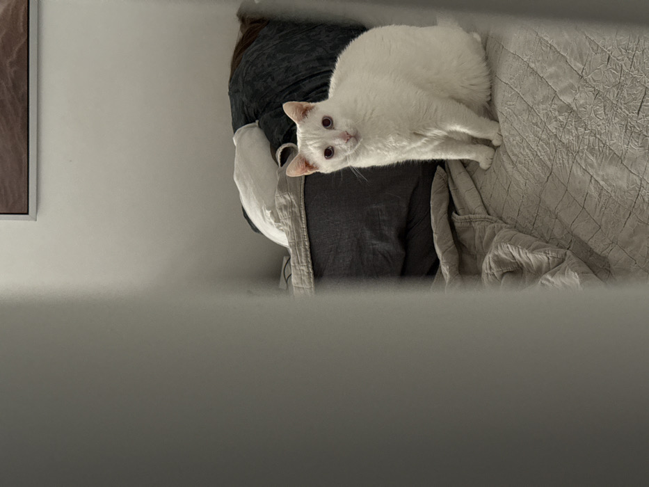 - "The image captures a white domestic cat with pinkish eyes sitting upright on a light grey quilted bed within an interior room located in Dos Hermanas, Spain" by FM-8JC2m2, licensed under CC BY 4.0