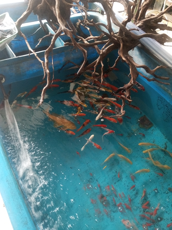 A blue, rectangular pond is filled with water and populated by numerous koi fish of various colors, including orange, red, white, and gold. A large, intricately branched piece of driftwood overhangs the pond. Bubbles and ripples disturb the water surface, suggesting aeration or movement. The pond's structure and surrounding environment appear to be outdoors.