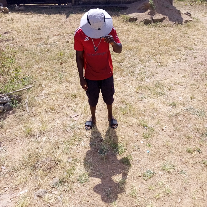 A single individual is observed standing outdoors in the city of Unknown, Unknown, on a patch of dry, light-brown earth with sparse, dessicated grass and some small green vegetation. The subject, appearing male, is wearing a red short-sleeved t-shirt with white stripes on the shoulders and a partially visible "Chevrolet" logo across the chest, dark cargo shorts, and dark slide sandals. A light-colored, wide-brimmed bucket hat with a dark band is worn, and a light-colored lanyard with an unknown dark object hangs from the neck. The subject's right hand is raised towards the brim of the hat, obscuring a portion of the face. A prominent, short shadow of the individual is cast directly in front, indicative of direct overhead sunlight. In the background to the left, a pile of rocks and a wooden stick are visible. To the right background, a mound of earth with several loose bricks at its base and some minor vegetation is present.