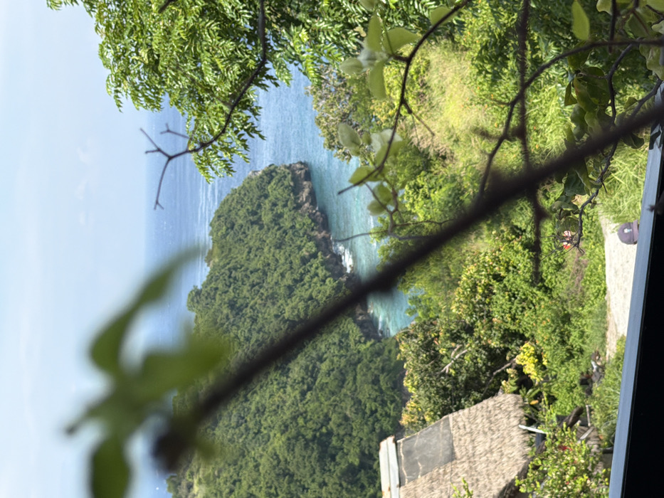 A high-angle, outdoor shot taken in Pejukutan, Indonesia, captures a coastal landscape under a bright, clear sky. The scene is dominated by a lush, green, heavily forested headland or peninsula extending into a turquoise-blue ocean. White surf is visible where the water meets the rocky base of the landmass. In the distant background, the deep blue ocean merges with the light blue sky at the horizon. In the lower-left quadrant, part of a building with a textured, thatched or straw roof is visible. Below and to the right of this structure, a light-colored dirt path winds through dense green vegetation. Two figures are faintly discernible on this path; one appears to wear a reddish top. In the immediate foreground, dark, out-of-focus foliage and branches partially obscure the view, creating a natural frame. A dark, horizontal bar or railing, also out of focus, spans the bottom of the image. The top of a person's head, wearing a dark baseball cap with a light-colored logo, is visible just above this bar in the lower-right foreground. No specific actions or interactions beyond the presence of these individuals are clearly identifiable.