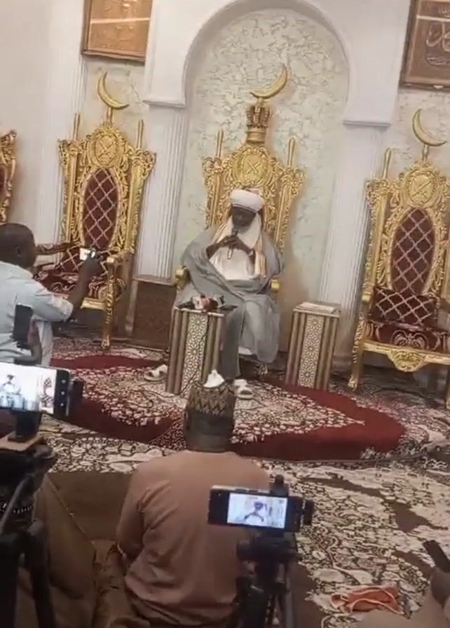 man in traditional attire sitting on an ornate golden throne. He is holding a microphone and speaking. Several people are filming him with cameras and phones. The room is elaborately decorated, with golden chairs, ornate rugs, and framed pictures on the wall. The man on the throne appears to be the focus of attention.