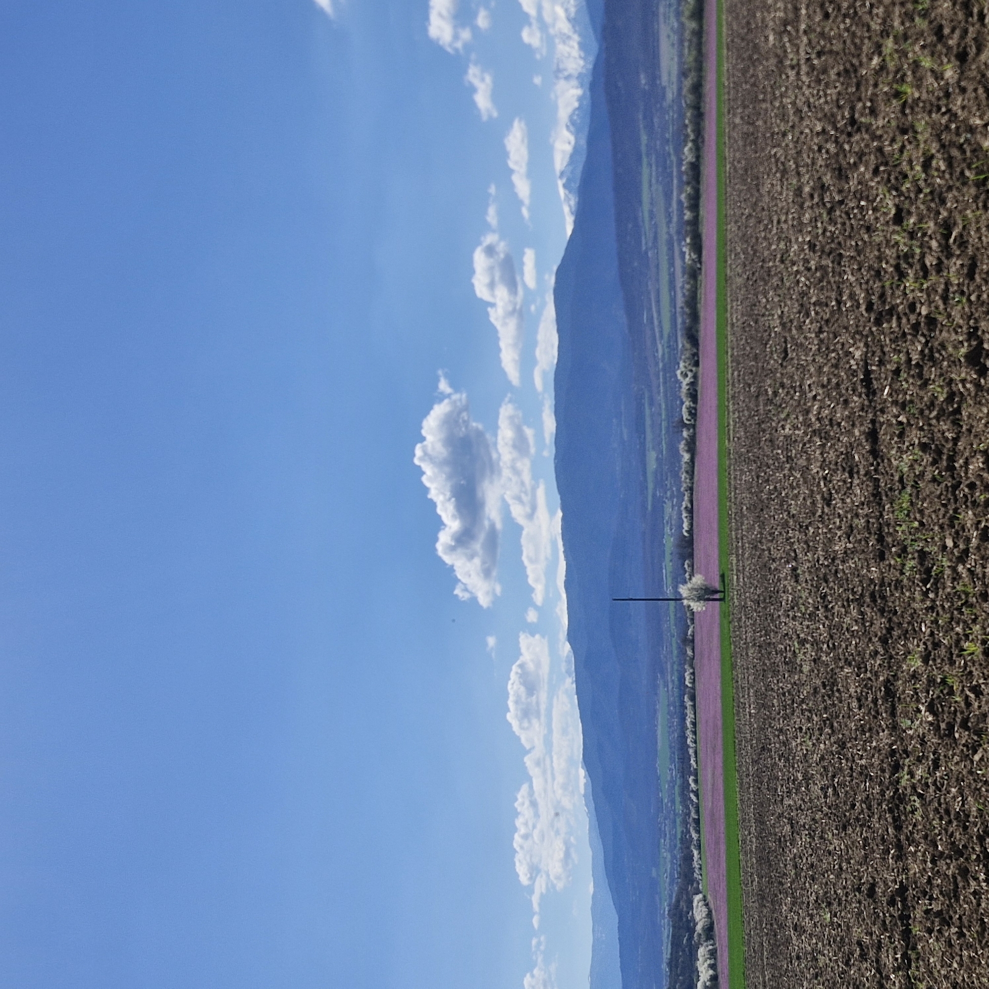 The image depicts a landscape scene in Hirevo, Bulgaria, featuring a bright blue sky with scattered white clouds. Adjacent to the sky is a mountain range. A field of purple flowers stretches horizontally across the scene, adjacent to ploughed soil. In the field there is a lone electrical pole and a single tree.