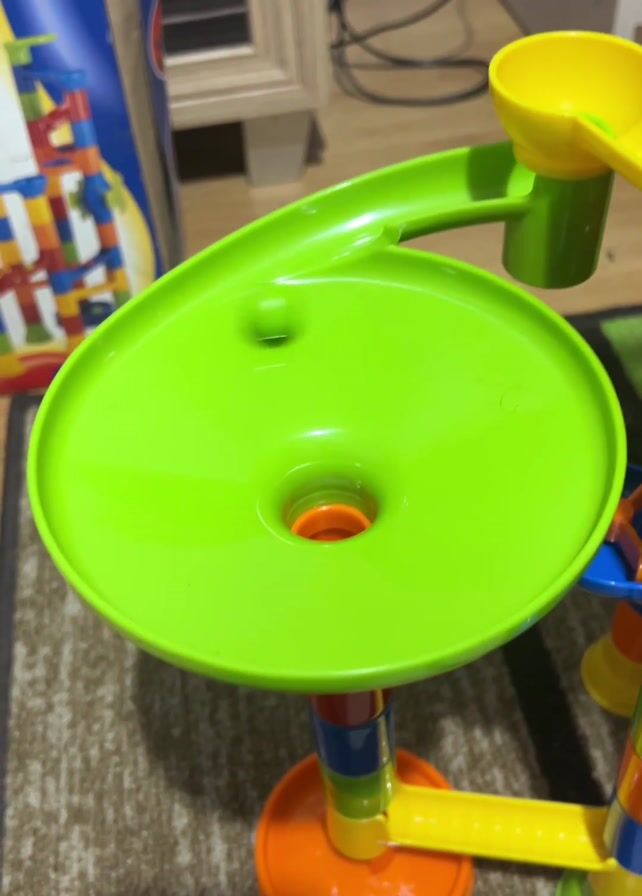 A close-up shot shows a green funnel-shaped piece of a marble run toy
