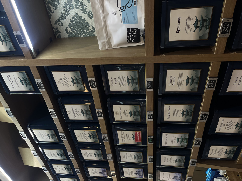 This image depicts the interior of a retail establishment, specifically a tea shop, in Krasnoyarsk, Russia