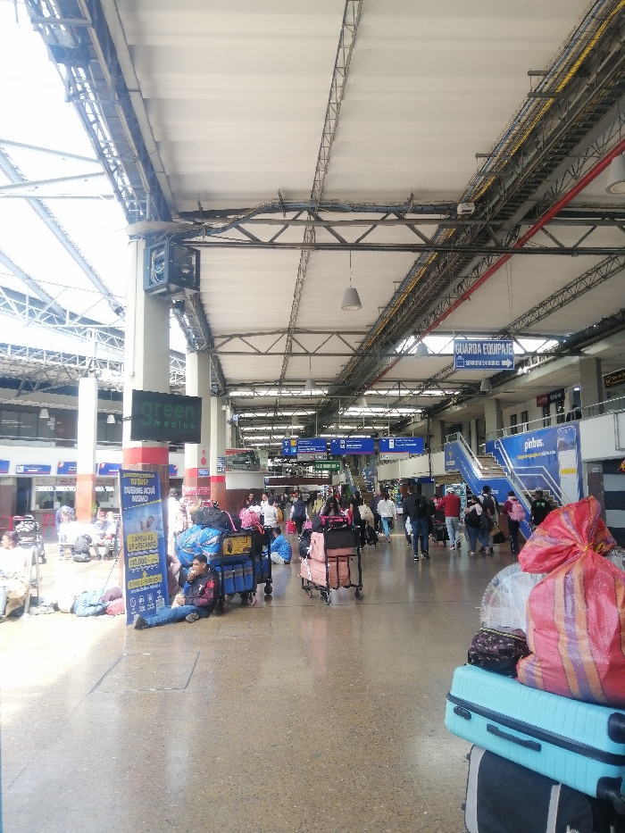 An indoor scene depicts a bustling transportation hub, likely a bus station, with numerous people and luggage carts dispersed across a spacious, well-lit concourse. Signage is visible overhead, including "GUARDA EQUIPAJE." A large "green medicas" sign stands prominently near the left side of the frame, adjacent to individuals sitting on the floor near their belongings. Suitcases and bags are stacked in the foreground. The station's architecture showcases a high ceiling with visible metal framework and support beams.
