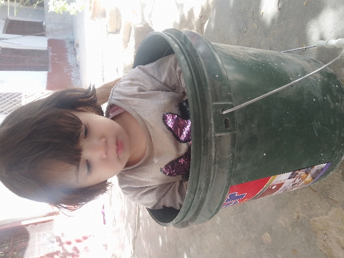 - "A young child is seated inside a large, dark green plastic bucket on a dusty ground surface in an outdoor residential setting in Quetta, Pakistan" by FM-rHWf02, licensed under CC BY 4.0