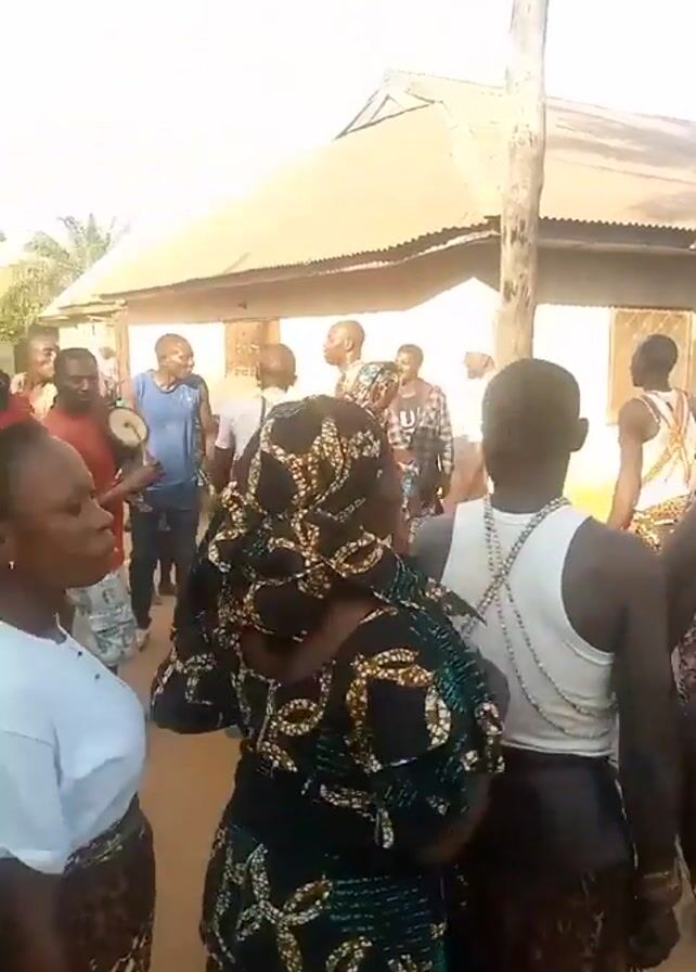 group of people participating in a traditional dance or ceremony. The participants are dressed in a mix of traditional and modern clothing. Some men are wearing tank tops, shorts, and beaded necklaces with what appear to be fringed loincloths. Many women are in colorful, patterned dresses and headwraps. Some are playing drums or other musical instruments. The event appears to be taking place outdoors in a village or rural setting, with simple buildings visible in the background. The atmosphere seems lively, with people engaged in music and dance.