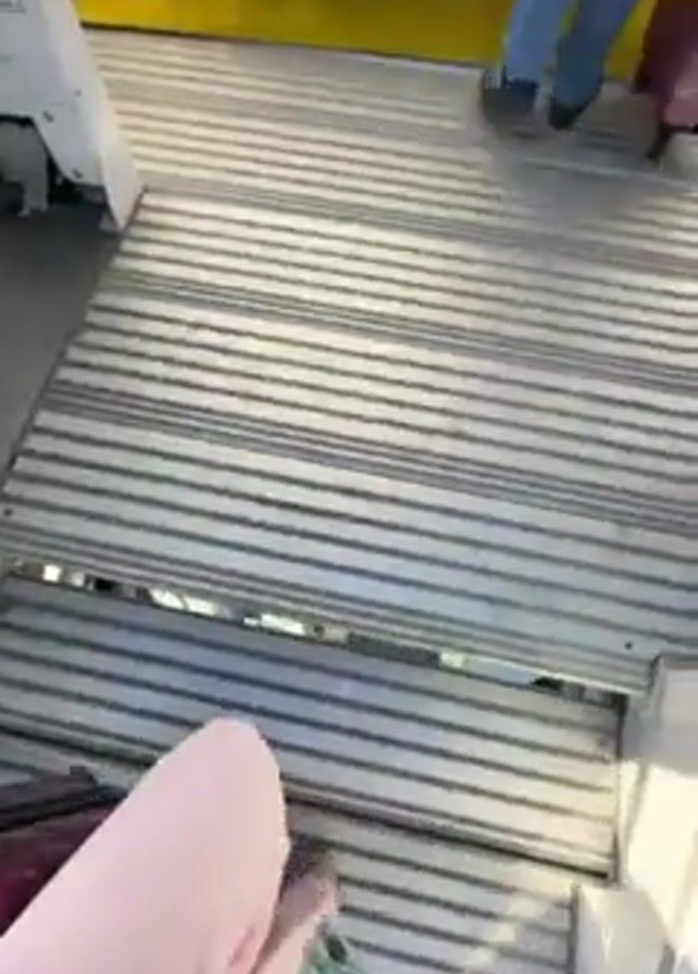 person deplaning from an airplane. The first shot is an interior view of a transportation vehicle, with luggage visible. The second shot shows a person with a pink suitcase walking out of the airplane door onto a set of stairs. The third shot shows an exterior view of the airplane, its wing, and other passengers deplaning. The final shot is another view of the person with the pink suitcase walking towards the airplane door, where a crew member can be seen inside.