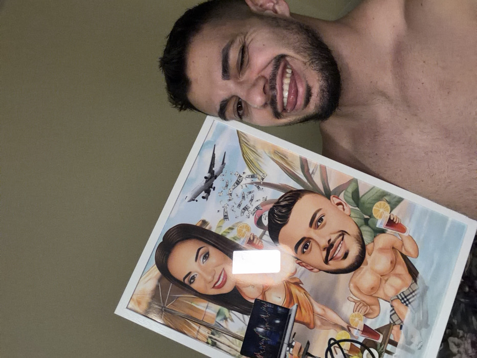 An adult male, bare-chested with short dark hair and a short beard, is depicted indoors in Burgas, Bulgaria. He is winking with his right eye, sticking his tongue out, and smiling directly at the viewer while holding a white-framed cartoon portrait. The portrait, held at an angle in the left portion of the image, illustrates two individuals in a tropical beach setting featuring palm trees, a blue sky, and water. The cartoon woman, positioned in the upper left of the artwork, has dark hair, is smiling, and wears a light-colored bikini top and sarong. A laptop displaying a candlestick chart rests on a small table near her. The cartoon man, in the lower center of the artwork, has dark hair, is smiling, is bare-chested, and wears patterned swim shorts while appearing to lounge in water, holding two drinks garnished with lemon slices. In the background of the portrait, a passenger airplane is depicted in the sky, with numerous dollar bills falling from it, and a red baseball cap is also visible. A bright rectangular reflection obscures a small portion of the cartoon woman's midsection within the artwork. The background behind the man and the artwork is a plain, light olive-green wall.