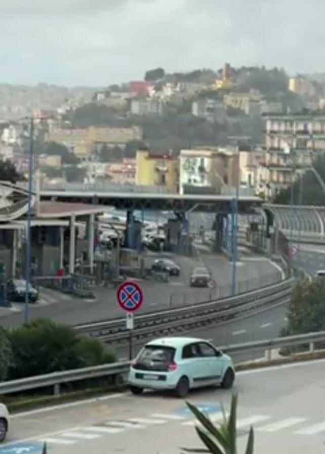 highway toll booth in Italy on a cloudy day. There are several cars going through the toll booth. In the foreground, a light blue Renault Twingo is parked on the side of the road near a no-parking sign. The background is a hilly cityscape with buildings of various colors. A few plants are visible in the lower part of the frame. The camera angle is slightly elevated, as if taken from a nearby building.