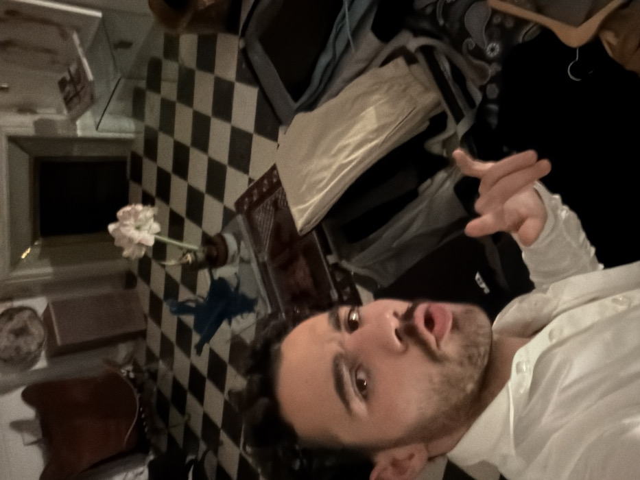 An indoor scene in Mauléon-d'Armagnac, France, depicts a dimly lit room with a black and white checkered floor. In the immediate foreground, a male individual, appearing to be in his twenties or thirties with dark hair and a beard, is visible from the chest up, wearing a white collared shirt. He is looking directly at the camera with his mouth slightly open in an expressive manner, and his right hand is raised and slightly curled in a gesture. To the right of the subject, an open black suitcase containing various folded clothes, including a light-colored item on top, is present. Another smaller, dark bag is partially visible beside it. Behind the subject and suitcases, a square glass coffee table holds a brown pot with a single plant bearing white flowers and a small blue sculptural object. A patterned rug is visible underneath the table. Further back in the room, a large fireplace with a dark, possibly empty, firebox is centered against a wall. To the left of the fireplace, a brown lounge chair with a metal frame is visible. To the right of the fireplace, a small glass side table holds an unidentified item. The lighting in the room is ambient and appears to be artificial, casting some shadows.