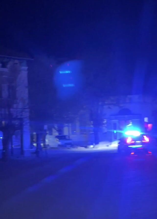 dark, dimly lit street scene at night. A police car with flashing blue lights is parked on the right side of the street, facing away from the camera. Two people are walking on the left side of the street. A white van is parked nearby. Buildings are visible on both sides of the street, with trees sparsely lining the sidewalks. The overall atmosphere is quiet and suggestive of a small town at night. There's a dialogue between two individuals, one asking why the person is filming the police officers.