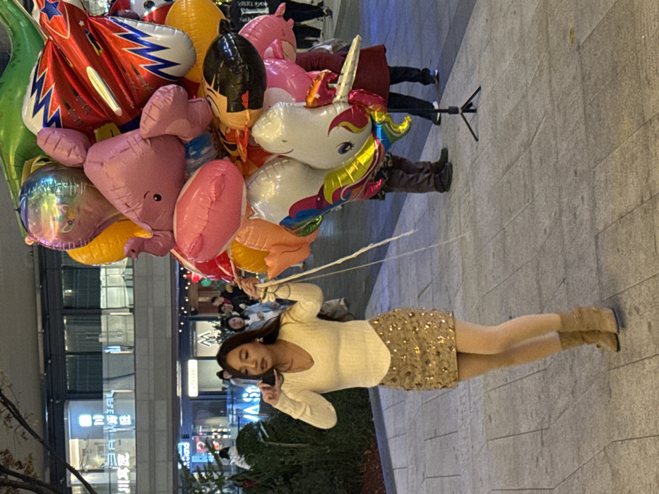 The scene is an outdoor public space in the city of Liangjiang, China, during the evening, characterized by artificial lighting. A young East Asian female is positioned slightly left of center, facing slightly right. She wears a light-colored, long-sleeved ribbed top with a V-neck and a gold-colored, sequined mini-skirt over light-colored stockings, completed with light brown ankle boots. Her left hand holds a dark-colored smartphone to her ear, consistent with being on a call, while her right hand is slightly raised, holding a light-colored string. To her right, a large cluster of numerous foil balloons of varying shapes and colors is visible, held by a largely obscured individual whose lower legs and dark clothing are partially visible behind the balloons. The balloons include forms such as a pink whale, a rainbow-colored unicorn, a red rocket, and various other round and iridescent shapes. A small, black tripod stands on the paved ground surface behind the balloons. In the background, a multi-story building with illuminated signs displaying Chinese characters is visible, and several blurred figures indicate a populated public area. Sparse greenery is present on the far left.