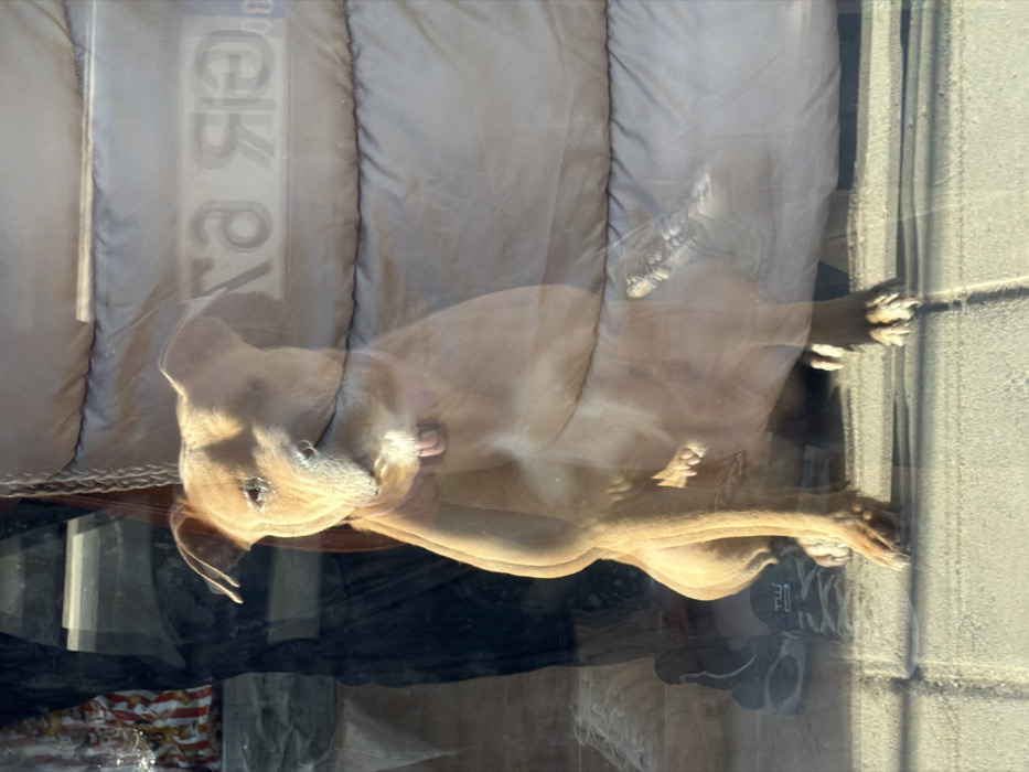 A fawn-colored, short-haired dog, possibly a pit bull type, wearing a pink collar, is seated on a light-colored tiled floor, looking left. The scene is observed through a glass storefront in the city of Ruse, Bulgaria. Inside, behind the dog and to its right, a stack of large, light-beige, horizontally sectioned padded cushions or furniture is visible. The glass exhibits significant reflections: on the left side, the lower legs and feet of a person wearing dark pants and dark athletic shoes with white soles (one displaying "TW" branding) are reflected, standing on a light-colored paved or tiled sidewalk. Faint, reversed text, possibly "ra er" or "ea er," resembling part of a vehicle license plate, is reflected onto the padded background. Strong natural light illuminates the scene, enhancing reflections on the glass. The dog's tongue is slightly visible, protruding from its mouth. There are no overt interactions occurring.