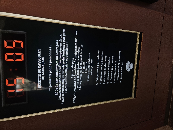 A vertical digital display, framed in dark brown with a golden inner border, is mounted on a dark reddish-brown wall in Avignonet-Lauragais, France. The screen's top section features a red digital clock illuminated to show "19:05". Below the clock, a white-on-black text field presents the title "RECETTE DU CASSOULET DU LAURAGAIS" (Recipe of Cassoulet from Lauragais). This is followed by a list of ingredients for four people, detailed in French, including Lauragais cannellini beans, duck confit legs, Toulouse sausage, various pork cuts (jarret, coustellous, couenne), a bouquet garni, onion, carrot, Cadours garlic, salt, and pepper. Beneath the ingredient list, eight numbered steps outline the preparation process in French, ranging from bean preparation to final oven baking. A white stylized chef's hat icon is positioned at the bottom of the recipe steps. A faint reflection is present on the display's surface.