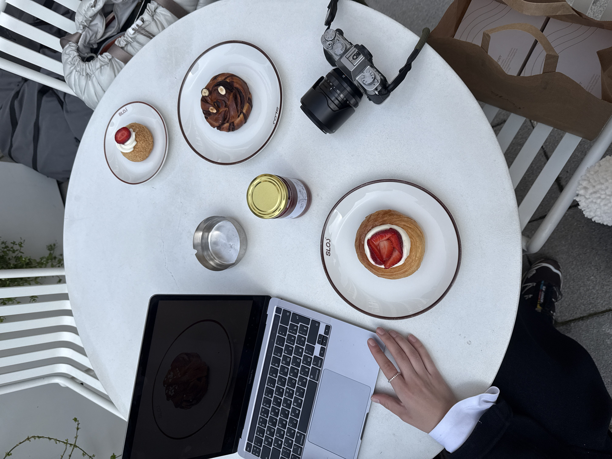 An overhead shot depicts a white round table at an outdoor cafe in Belgrade, Serbia, specifically at a location identified by "SLOJ" branding on plates. A person's left hand, wearing a silver ring, rests near an open silver MacBook Pro laptop with a dark screen, partially displaying Cyrillic/Latin keyboard characters. Three white ceramic plates with brown rims, all bearing the "SLOJ" logo, are present. One plate holds a circular pastry topped with white cream and sliced strawberries. A second plate contains a dark, swirled pastry adorned with nuts. A smaller, third plate features a choux pastry topped with white cream and a whole strawberry. A small glass jar with a gold lid containing a red preserve is positioned centrally. An empty silver ashtray is located near the laptop. A silver and black mirrorless camera, equipped with a black lens and strap, rests on the table's right side. A light grey puffer jacket is draped over a white slatted chair in the background, and a brown paper bag rests on another white chair beneath the table. The ground surface consists of grey paving stones.