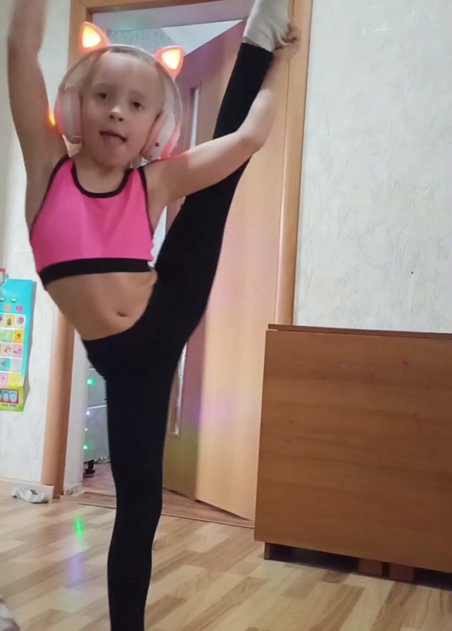 - "A young girl, with blonde hair tied back in a ponytail and wearing a pink sports bra, black leggings, and headphones with light-up cat ears, is performing a dance or exercise routine in what appears to be a child's bedroom" by FM-KPJIy1, licensed under CC BY 4.0